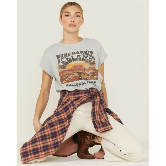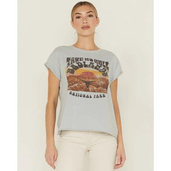 - Front “Take No Bull Badlands National Park” with sunset scene and longhorn skull graphic print