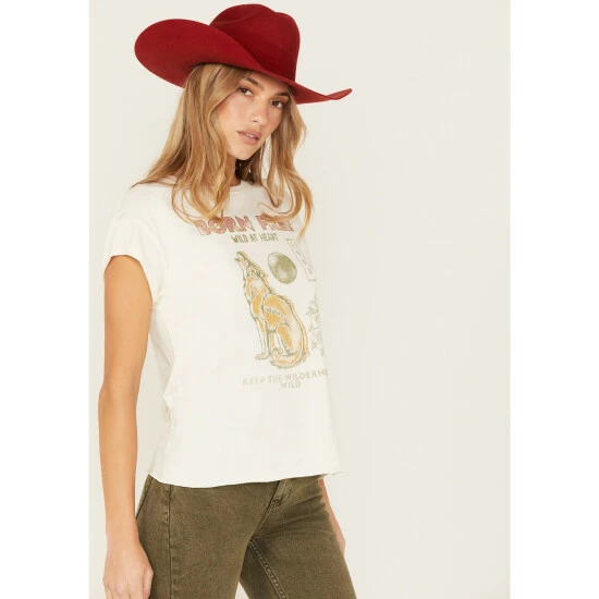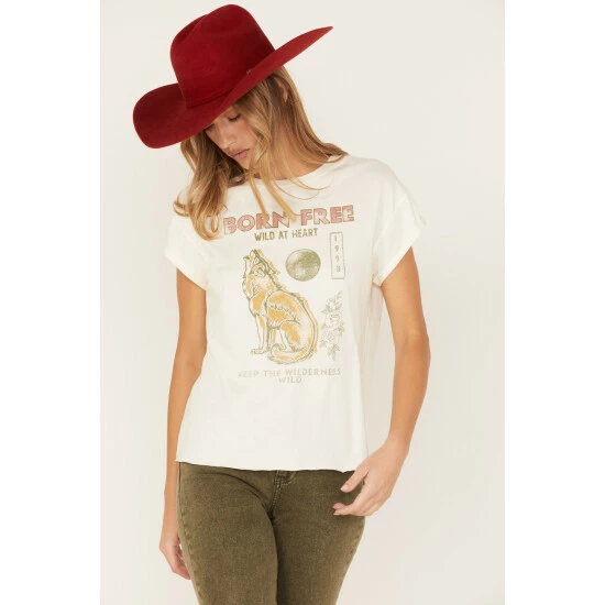 - Ivory with “Born Free Wild At Heart / Keep The Wilderness Wild” and vintage howling wolf moon graphic on front
