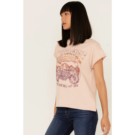 - Peach with “Motorcycle Raceway / Get On Your Bike And Ride” motorcycle vintage graphic on front